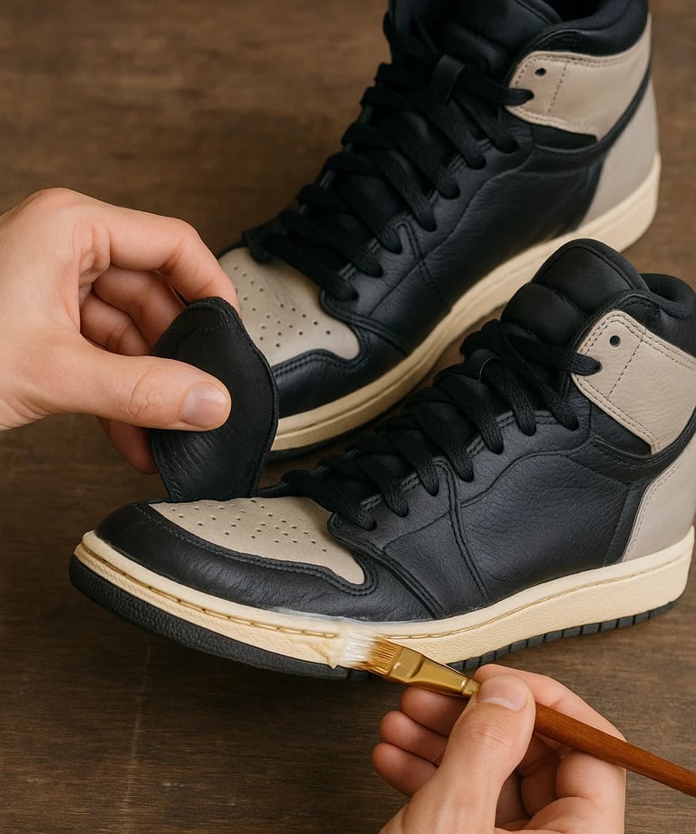 Layanan untuk merekatkan kembali bagian sol atau panel sepatu yang terlepas akibat pemakaian atau umur sepatu. Menggunakan lem khusus berkualitas tinggi yang tahan lama dan aman untuk semua jenis material,